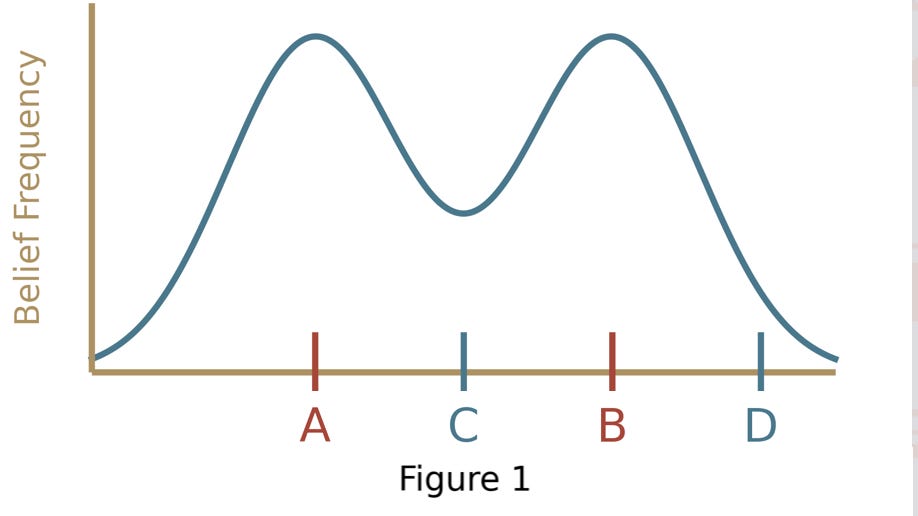 There is an intuitive appeal towards a “fair and balanced” treatment of politically contentious issues. Implicit is a belief that our political beliefs are bimodal, as displayed in Figure 1 below.